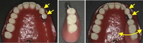 Im obigen Beispiel fehlen die drei hinteren Zähne. Um diese durch eine herausnehmbare Prothese zu ersetzen, braucht man Halt an natürlichen Zähnen. Mindesten zwei eigene Zähne müssen dazu beschliffen werden (gelbe Pfeile, linkes Bild).