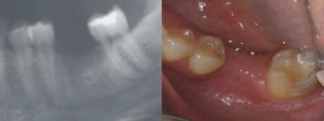 Ein Zahn ist durch eine tiefe Karies verloren gegangen. Die Nachbarzähne sind nahezu unversehrt, nur der letzte Zahn hat eine kleine Füllung (weiß im Röntgenbild). Um weitere Folgeschäden zu vermeiden, entschied sich die Patientin für ein Zahnimplantat.