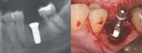 Drei Monate nach der Zahnentfernung wurde in einem kleinen Eingriff ein Zahnimplantat in die Lücke gesetzt. Auf dem Röntgenbild links sieht man das Schraubenimplantat (weiß) und rechts das Zahnimplantat im Mund direkt nach dem Einsetzen. Der Einbringpfosten ist noch auf dem Implantat zu erkennen. Dieser wird abgeschraubt und auf das Implantat für die Einheilzeit eine flache Verschlusskappe aufgeschraubt.