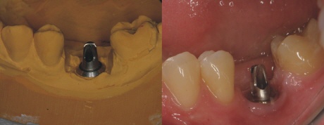 Nach der Einheilung des Implantates wird ein individueller Aufbau für das Implantat im Zahnlabor hergestellt. Man sieht den Aufbau links auf dem Gipsmodell des Zahntechnikers und rechts eingeschraubt auf das Implantat.