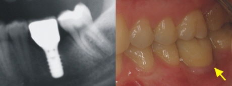 Der gelbe Pfeil zeigt auf dem Bild rechts, wo sich die Implantatkrone in der Zahnreihe „versteckt“.