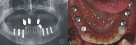 Zum Ersatz der fehlenden Zähne wurden auf jeder Seite drei Implantate eingebracht. Auf dem rechten Bild sieht man die Verschlusskappen der sechs eingebrachten Implantate.