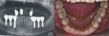 Sind mehrere Seitenzähne verlorengegangen, so entsteht schnell eine sogenannte verkürzte Zahnreihe. Das Problem an dieser Situation ist einerseits, dass sie nicht stabil ist, d.h. nicht so belassen werden kann, da es sonst zu funktionellen Problemen kommen kann und andererseits, dass sie konventionell nur mit einer herausnehmbaren Prothese versorgt werden kann, da für eine Brücke der wichtige letzte Zahn fehlt.