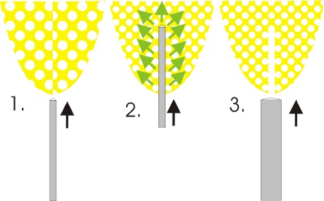 2. Das eingebrachte Instrument (grau) verdrängt den umliegenden Knochen, die Markräume werden kleiner, der Knochen fester.