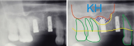 Die gelbe untere Linie entspricht dem Kieferkamm, der bis zur oberen gelben Linie verläuft. Über dieser oberen gelben Linie beginnt die Kieferhöhle (KH). Der Abstand zwischen den beiden gelben Linien zeigt, wie viel vertikaler Knochen (Knochenhöhe) vorhanden ist. Der rote Pfeil zeigt den unzureichenden Knochenabschnitt.
