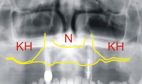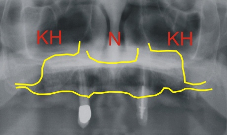 Das Röntgenbild zeigt die geringe Knochenhöhe im Seitenzahnbereich. Die untere gelbe Linie entspricht dem knöchernen Kieferkamm. Die gelbe Linie darüber entspricht dem knöchernen Boden der Kieferhöhle (KH). Im mittleren Bereich ist der knöcherne Nasenboden (N) als gelbe Linie eingezeichnet.