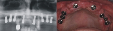 Acht Implantate bieten im Oberkiefer eine solide Basis für eine festsitzende Brückenkonstruktion. Auf dem Bild oben rechts sieht man die Implantatkappen in der Mundhöhle. Die Implantate müssen nun wiederum 4-5 Monate im Knochen einheilen.