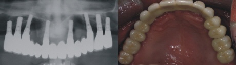 Das Röntgenkontrollbild oben links zeigt den exakten Sitz der Brückenkonstruktion. Oben rechts sieht man die einzementierte Brücke im Mund. Die Versorgung ist nur auf den Kieferkamm begrenzt, das heiß der ganze Gaumen ist frei. Dies bietet höchsten Komfort und ein ästhetisches Optimum, ganz so wie bei den eigenen Zähnen.