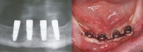 In aller Regel können die Implantate in örtlicher Betäubung völlig schmezfrei in den Kieferknochen eingebracht werden. Der Wundbereich wird mit feinen Nähten verschlossen (Bild oben rechts). Der routinierte Behandler wird dazu nicht länger als zwischen 20 und 40 Minuten benötigen. Die Implantate heilen in diesem Fall unter der Schleimhaut (geschlossen) ein und die Fäden werden nach ca. sieben Tagen entfernt. Ein Röntgenbild direkt nach dem Einbringen der Implantate bestätigt die korrekte Positionierung.