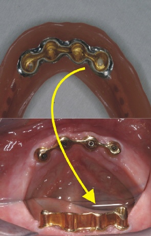 Das entsprechende Gegenstück zu dem Steg ist in der Prothese eingearbeitet, die quasi auf den Steg aufgesezt wird. Die Kaukraft kann nun über die Prothese auf die Implantate in den Kieferknochen weitergeleitet werden.