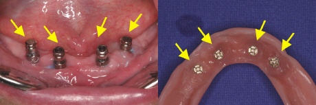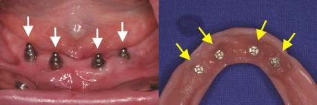 Die „Snaps“ werden auf die Kugelköpfe gesetzt (linkes Bild, gelbe Pfeile). Flüssiger Kunststoff wird in die ausgeschliffenen Prothesenanteile eingebracht und die Prothese in den Mund gesetzt. Ist der Kunstoff nach ein paar Minuten fest geworden, so kann die Prothese wieder herausgenommen werden und die „Snaps“ sind in der Prothese fest verankert (rechtes Bild, gelbe Pfeile).