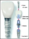 Auf dieses Implantat wird ein so genannter Aufbau aufgeschraubt. Dieser bekommt seinen Halt über eine spezielle Innenverbindung, oder in seltenen Fällen über eine Außenverbindung. Diese Verbindung bietet den Rotationsschutz des Aufbaus und der Krone. |