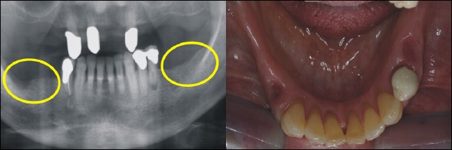 Die Ausgangssituation zeigt eine beidseitige Freiendsituation (gelbe Kreise), die bislang mit einer herausnehmbaren Klammerprothese versorgt war. Die Patientin fühlte sich in ihrer Lebensqualität stark beeinträchtigt und wünschte einen festen Zahnersatz. Das Bild rechts zeigt in der Aufsicht die zahnlosen Kieferkammabschnitte. |