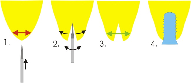 1. Im Querschnitt ist der Kieferknochen modellhaft dargestellt (gelb). Der rote Pfeil zeigt den zu schmalen Kieferknochenbereich. 2. Ein spitzes Instrument (eine Art Meißel) dient dazu, den Knochen vorsichtig zu spreizen und damit zu verbreitern. 3. Der grüne Pfeil zeigt den Breitengewinn im vergleich zur Ausgangssituation. 4. Nun kann das Implantat eingebracht werden, ohne dass zusätzlich Knochen aufgelagert werden muss.