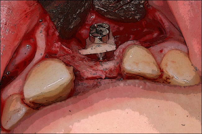 Ist der Kieferknochen in der Breite nicht ausreichend stark, so dass das Implantat nicht ringsherum von Knochen bedeckt ist, wird Knochen auf die entsprechenden Bereiche aufgelagert. Je nach individuellem Fall, wird der Knochen mit partikulärer Masse, also zerkleinerter Knochenmasse, oder aber als solider Block aufgebracht. |