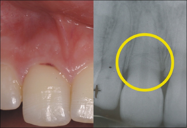 Das Röntgenbild zeigt es deutlich als schwarze Linie in der Mitte der Wurzel (gelber Kreis). Der Zahn in der Mitte der Wurzel ist quer gebrochen. Im Mund (links) zeigt sich eine in der Position veränderte Krone (der Mediziner nennt das luxiert), die zudem beweglich ist. |