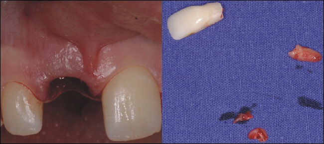 Der Zahn ist durch seine Fraktur (Bruch) nicht zu erhalten und wird schonend entfernt. Auf dem rechten Bild sieht man die beiden Fragmente (Krone und Wurzelende), links die Situation direkt nach der Zahnentfernung. |