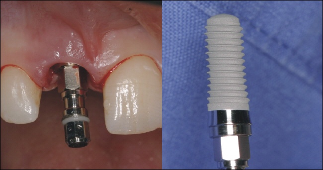 Da in diesem Fall die Knochenstruktur komplett erhalten war, konnte in das Zahnfach direkt ein passendes Implantat eingebracht werden. Das linke Bild zeigt die optimale Positionierung, der Hilfspfosten (Einbringpfosten) des Implantates ist noch auf dem Implantat moniert. |
