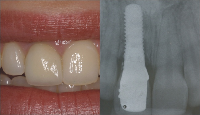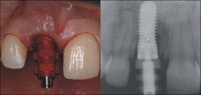Am folgenden Tag wird eine provisorische Krone auf das Implantat eingesetzt (links). Die Röntgenkontrolle (rechts) zeigt den perfekten Sitz der Krone. Sie ist vor allem ein ästhetischer Ersatz, da Belastungen in der Einheilphase möglichst vermieden werden sollten, um ein erfolgreiches Einheilen des Implantates zu gewährleisten. Nach der Einheilzeit wird unter ästhetischen und funktionellen Gesichtspunkten eine definitive Krone hergestellt. |