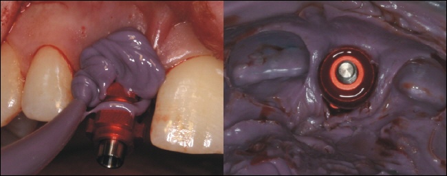 Mithilfe einer Abformmasse wird die Implantatposition abgeformt. Das rechte Bild zeigt den zuvor auf dem Implantat montierten Pfosten nun in der aus dem Mund genommenen Abformung. Diese dient zu Herstellung eines Gipsmodells, welches die genaue Mundsituation wiedergibt. Der Zahntechniker fertigt nun auf dem Gipsmodell eine provisorische Krone an. |