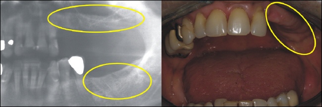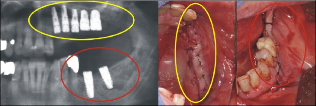 Im Oberkiefer (gelber Kreis) und im Unterkiefer (roter Kreis) wurden die fehlenden Zähne durch Implantate ersetzt. Auf den rechten Bildern sieht man, dass die Zähne geschlossen, also geschützt unter der Schleimhaut, einheilen. |