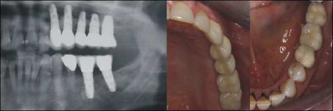 Jedes Implantat wird mit einer einzelnen Krone versorgt, da dadurch höchste Genauigkeit und beste Pflegemöglichkeit gewährleistet wird. Der Implantologe nennt diese Variante eine Versorgung mit Einzelzahnkronen oder auch eine „Zahn zu Zahn“ Versorgung im Gegensatz zu einer implantatgetragenen Brücke, die im Oberkiefer ebenfalls auf nur drei Implantaten theoretisch möglich wäre. |