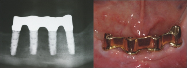 Die Standard-Versorgung des zahnlosen Unterkiefers besteht aus einer implantatgetragenen Prothese auf vier Implantaten. Es ist eine der ältesten Versorgungsvarianten um mit Hilfe von Implantaten festen Halt für eine Prthese zu bekommen. |
