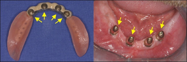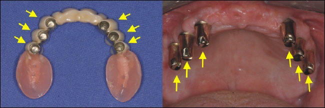 Die Außenteleskopkronen (gelbe Pfeile im linken Bild) der Oberkiefer-Implantatarbeit werden auf die auf den Implantaten festzementierten Innenkronen (gelbe Pfeile im rechten Bild) aufgeschoben. |