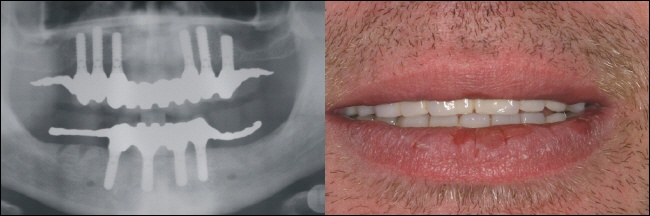 Die fertige Arbeit ermöglicht auf den sechs Teleskopen im Oberkiefer eine rein kieferkammbegrenzte, also gaumenfreie Versorgung. Das Röntgenbild links zeigt die solide Konstruktion, die eine reine Kaukraftweiterleitung in den Kieferknochen ermöglicht. |