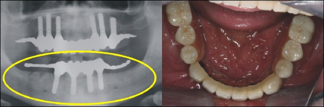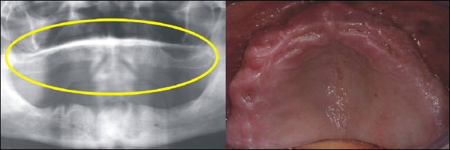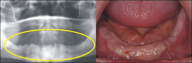 Der zahnlose Unterkiefer rechts im Bild bietet keinen Halt mehr für eine Prothese. Links zeigt sich der zahnlose Knochenabschnitt im Röntgenbild (gelber Kreis). |