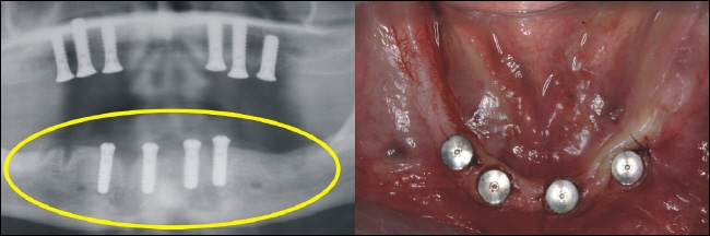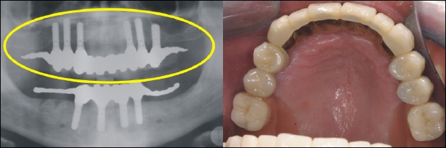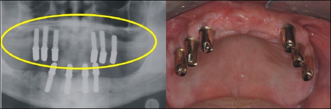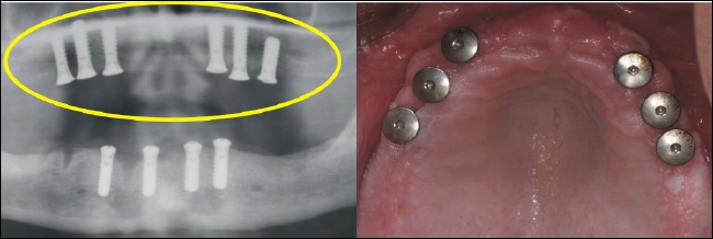 Sechs strategisch günstig positionierte Implantate wurden im Oberkiefer eingebracht, um nach der Einheilung optimalen Halt für die Prothese zu gewährleisten (gelber Kreis im Röntgenbild). |