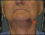 Das Auftreten von Hämatomen ist stark vom Bindegewebstyp des Patienten abhängig. Gerade bei älteren Patienten mit einem lockeren und fragilen Bindegewebe treten Hämatome öfter auf. Meist wissen die Patienten selbst sehr genau, ob sie zu blauen Flecken neigen. Die Hämatome sacken entsprechend der Schwerkraft in den Bindegewebsschichten nach unten ab und durchlaufen viele Farbstufen bis sie dann nach 1-2 Wochen wieder abgeklungen sind. Wenn im Unterkiefer implantiert wird, tritt das Hämatom in der Regel zuerst im Wangen-Kieferwinkelbereich auf und wandert dann den Hals hin ab bis zum Brustbein. Oftmals sind Patienten erschrocken, wenn sich nach dem Einsetzen von Implantaten im Oberkiefer am Folgetag ein blaues Auge zeigt.