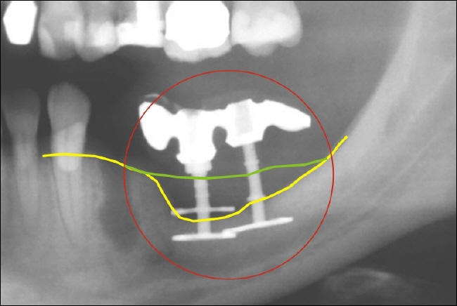 Knochenabbau Die Röntgenaufnahme zeigt den massiven Knochenverlust an zwei Diskimplantaten (zwischen der grünen und der gelben Linie). Die gelbe Linie zeigt den aktuellen Knochenverlauf, die grüne demonstriert den ursprünglichen. Die obere Scheibe an dem linken Diskimplantat ist gar nicht mehr von Knochen umgeben. Die Implantate sollten entfernt werden, um weiteren Knochenabbau zu verhindern.