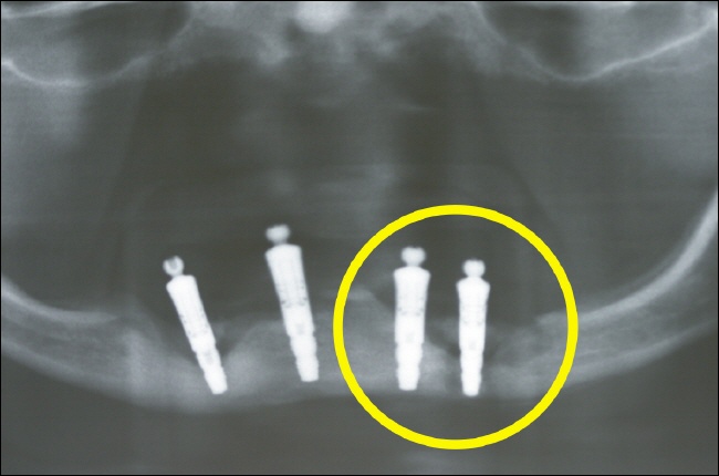 Heftiger Knochenabbau (Risiko Kieferfraktur) Das Röntgenübersichtsbild zeigt nichts Gutes. Die dunklen Bereiche um die Implantate (helle "Stifte") spiegeln den daramtischen Knochenabbau wieder. Besonders am ganz rechten Implantat (gelber Kreis) reicht dieser Knochenabbau schon durch den gesamten Unterkeiferkörper. Es besteht hierbei ein sehr hohes Risiko für eine entzündungsbedingte Kieferfraktur (sog. pathologische Fraktur).