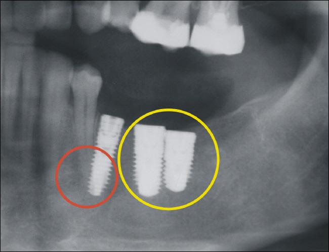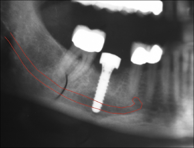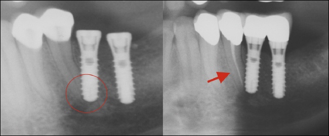 Fehlende Planung, Routine und anatomische Besonderheiten oder Unkenntnis können dazu führen, dass natürliche Zahnwurzeln in der Nähe der Implantationsstelle beim Implantatlochbohren verletzt werden. Im ungünstigsten Fall bedeutet dies, dass der Zahn einen derartigen Schaden erlitten hat, dass eine Devitalisierung (Abtötung) und anschließende Wurzelfüllung erforderlich ist. |