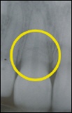 Wurzelbruch nach Sportunfall Das Röntgenbild zeigt die Bruchlinie in der Miitte des gelben Kreises als schwaze dünne Linie horizontal verlaufend. |