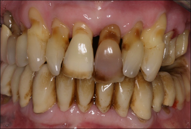 Bild der Zerstörung Durch mikrobielle Beläge (vor allem agressive Bakterien, sogenannte "Killerkeime") kommt es zum Abbau des gesamten Zahnhalteapparates. Die Folgen: die Zähne werden optisch immer länger und immer beweglicher, bis letztenendes das ganze "Kartenhaus" zusammenfällt. |