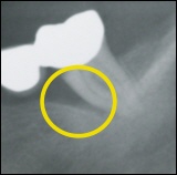 Vorsicht Tasche! Das Röntgenbild zeigt den massiven Knochenverlust als schwarze Lücke. |