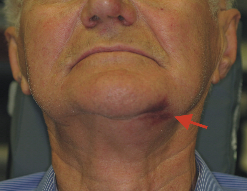 Wenn im Unterkiefer implantiert wird, tritt das Hämatom in der Regel zuerst im Wangen-Kieferwinkelbereich auf und wandert dann den Hals hin ab bis zum Brustbein.