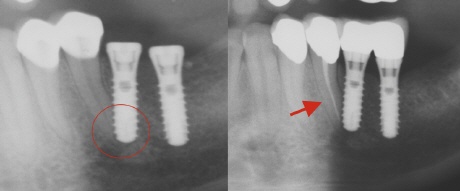 Die Schädigung von Nachbarwurzeln ist immer eine Folge fehlender Planung. Weder die Position der Implantate zueinander, noch die Implantatachse sind in diesem Fall richtig bestimmt worden. Auf dem Bild oben links sieht man, wie der Zahn durch das Implantat verletzt wurden (roter Kreis). Dies hatte zur Folge, dass der "angebohrte" Zahn mit "seinem Leben zahlen" musste und eine Wurzelfüllung benötigte (roter Pfeil).