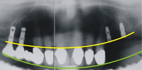 Links auf dem Röntgenbild sieht man zwei bereits versorgte Implantate. Rechts wurden zwei neue Implantate eingebracht. Man beachte rechts eine bis zur Kauebene (grüne Linie) zu überbrückende erhebliche Strecke durch den späteren Zahnersatz.