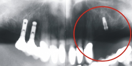 Schon nach drei Jahren scheitert die Versorgung offensichtlich aufgrund der statischen Fehlkonstruktion. Das verbliebene Implantat ist nicht mehr nutzbar, lediglich eine Neuimplantation mit ausreichend langen Implantaten ist in diesem Fall sinnvoll.