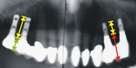 Die Pfeile verdeutlichen das statische Problem rechts auf dem Bild. Es besteht ein erhebliches Missverhältnis zwischen dem Kraftarm, symbolisiert durch den gelben Pfeil (entspricht der Implantatlänge), und dem Hebelarm, symbolisiert durch den roten Pfeil (entspricht der Kronenlänge).