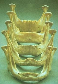 Eindrucksvoll zeigt das Bild rechts, wie sich im zahnlosen Kiefer der Knochen dramatisch abbaut. Von dem Kiefer hinten (kurz nach der Zahnentfernung) bis nach vorne (nach langjähriger Tragezeit einer Totalprothese) zeigt sich ein ein enormer Höhenverlust der Kieferknochens.