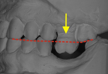 Das Bild oben zeigt eine jahrelang bestehende Lückensituation. Nur ein Zahn feht, dies hat jedoch mit den Jahren dazu geführt, dass der nicht abgestützte Zahn (gelber Pfeil) aus seinem Zahnfach dem Unterkiefer entgegen wächst. Die gestrichelte rote Linie zeigt die Kauebene, die von den Höckerspitzen im Normalfall berührt werden und zeigt eindrucksvoll die enormen Veränderungen. Man spricht in diesem Fall von einer instabilen Situation da sich immer weitere Veränderungen ergeben. Bei Mahlbewegungen ist dieser Zahn sogar ein Hinderniss, das das Zahnzusammenspiel gestört ist. In dieser fortgeschrittenen Situation ist der obere Zahn kaum noch zu retten und muß entfernt werden.